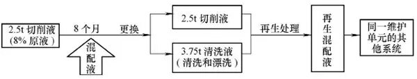 。2)實(shí)施步驟。以每個(gè)統籌維護單元為維護單位。對于每一個(gè)切削液系統,使用到一定時(shí)間后,進(jìn)行切削液的更換。原用液不排至污水站,而是進(jìn)行凈化處理,之后,作為混配液加注到同一維護單元的其它系統中,而本切削液系統配制新的切削液。